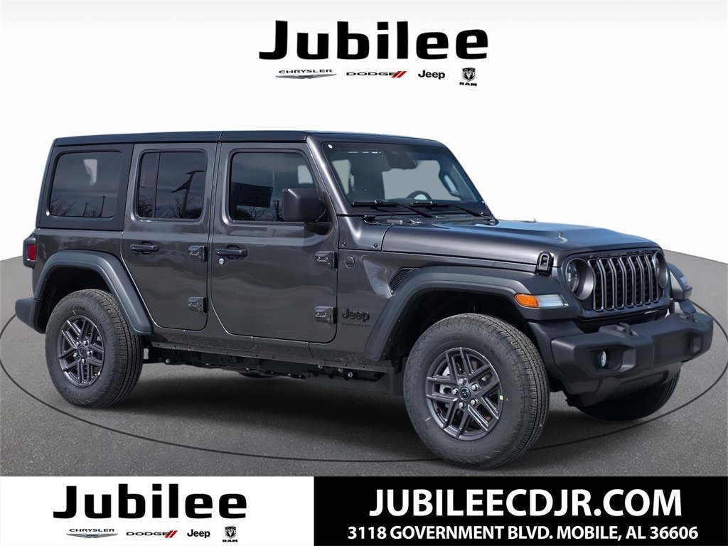 Check out this New 2026 Jeep Wrangler Sport S available at Jubilee Chrysler Jeep Dodge Ram in Mobile AL. Offered at just $47352, this Jeep Wrangler wonât last long. This 4WD Jeep Wrangler Sport S is powered by a 3.6L V6 24V VVT an includes these features and benefits Convenience Group (2-Door Passive Entry, Front Door Locks, Air Conditioning with Auto Temp Control, Air Filtering, Cluster 7.0" TFT Color Display, Emergency/Assistance Call, Heated Front Seats, Heated Steering Wheel, and Universal Garage Door Opener), LED Headlamp and Fog Lamp Group (Front LED Fog Lamps and LED Premium Reflector Headlamps), Quick Order Package 24S Sport S (Advanced Brake Assist, Automatic Headlamps, Corning Gorilla Glass, Deep Tint Sunscreen Windows, Enhanced Adaptive Cruise Control, Full Speed Forward Collision Warning Plus, Power Heated Mirrors, Premium Wrapped Steering Wheel, Security Alarm, Sun Visors with Illuminated Vanity Mirrors, and Wheels: 17" x 7.5" Gray), 12.3" Touchscreen Display, 3.45 Overall Top Gear Ratio, 4-Wheel Disc Brakes, 4G LTE Wi-Fi Hot Spot, 8 Speakers, ABS brakes, Air Conditioning, AM/FM radio: SiriusXM with 360L, Apple CarPlay, Apple CarPlay/Android Auto, Aux Battery, Black 3-Piece Hard Top, Black MOPAR Perforated Leather, Brake assist, Compass, Connectivity - US/Canada, Delay-off headlights, Driver door bin, Driver vanity mirror, Dual front impact airbags, Dual front side impact airbags, Electronic Stability Control, For More Info, Call 800-643-2112, Freedom Panel Storage Bag, Front anti-roll bar, Front Bucket Seats, Front Center Armrest w/Storage, Front fog lights, Front reading lights, Google Android Auto, Illuminated entry, Integrated Center Stack Radio, Integrated roll-over protection, Low tire pressure warning, MOPAR All-Weather Floor Mats, Myflexcare Service Plan, No Soft Top, Non-Lock Fuel Cap Without Discriminator, Normal Duty Suspension, Occupant sensing airbag, Outside temperature display, Overhead airbag, Panic alarm, ParkView Rear Back-Up Camera, Passenger door bin, Passenger vanity mirror, Power steering, Power windows, Radio data system, Radio: Uconnect 5 with 12.3" Display, Rear anti-roll bar, Rear reading lights, Rear Window Defroster, Rear Window Wiper/Washer, Remote keyless entry, SiriusXM Radio Service, SiriusXM with 360L, Speed control, Split folding rear seat, Steering wheel mounted audio controls, Stop-Start Dual Battery System, Tachometer, Telescoping steering wheel, Tilt steering wheel, Traction control, Trip computer, Variably intermittent wipers, and Wheels: 17" x 7.5" Black Steel Styled.